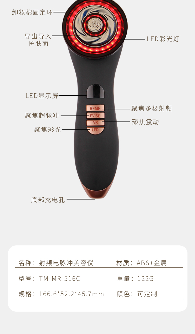 RF射頻周護理 促進肌底微循環,提亮膚色 EMS 日護理增加肌膚彈性,改善暗黃,淡化色斑 VR震動 精華導入 讓肌膚更加滋潤亮麗 微電流補充肌膚水分使之恢復滋潤、光滑、柔嫩 美容光深層滲透,肌膚自然修復 每天十分鐘,讓肌膚重綻光芒 。,EMS彩光射頻美容儀-516CEMS彩光射頻美容儀-516C," />