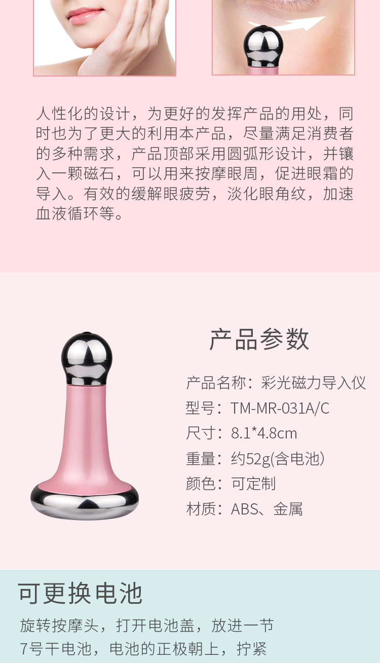 超1000個8微米級磁粒組成特別磁場 紅光振動導入導出針對有效的推動 美白嫩膚,幫忙修復痘痘肌 感應開關,安全有效,沁透滋養 振動按摩,促進美妝產品的吸收 促進肌底微循環,令肌膚煥然一新 ,彩光磁力導入美容儀-031C彩光磁力導入美容儀-031C彩光磁力導入美容儀," />
