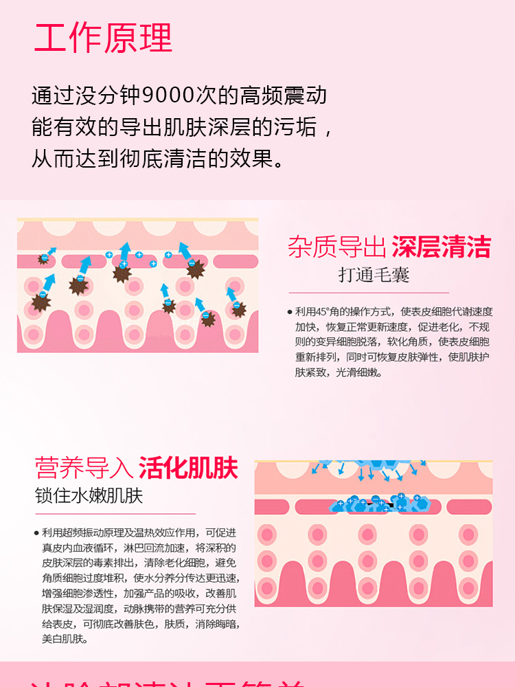 溫和潔面模式為任何面部護理墊定最重要的基礎。它完美融入您的日常護理,幫助您去除死皮,打開堵塞毛孔并清除臟污、油膩及化妝品殘留。比手洗更深層地清潔肌膚,并清除深層毒素就會導致痤瘡、暗瘡、黑色素沉淀;能加快細胞新陳代謝、血液循環,讓眼角紋、黑眼圈、松弛的面部皮膚遠離人的臉頰。在保持肌膚自然水潤的同時促進肌膚有效吸收您最喜愛的護膚產品。抗衰老模式通過作用于肌膚表面下的溫和低頻脈動,放松面部肌肉,促進細胞再生,讓肌膚更光滑細膩,煥發自然光澤,重現青春光采。